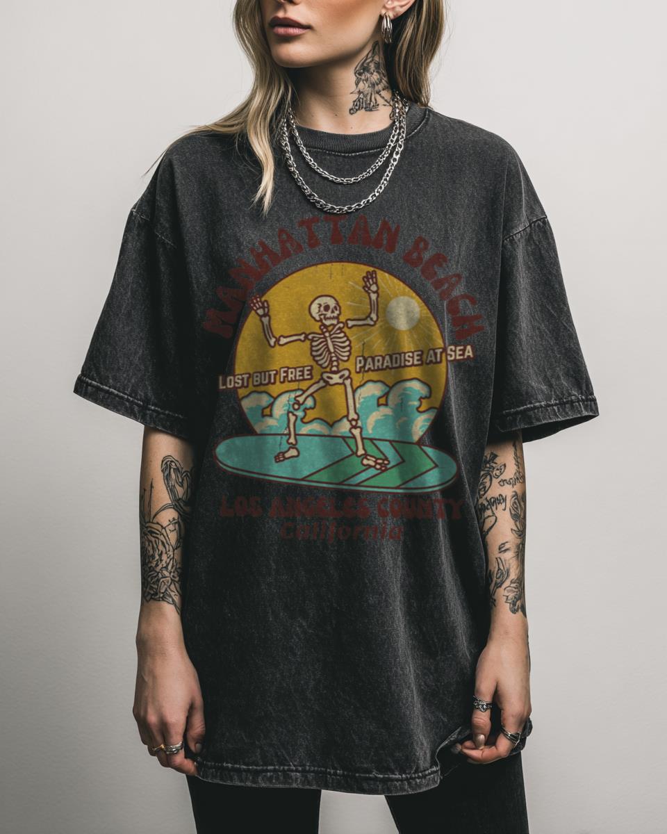 Missing the sun-drenched beaches and cool surf vibes of 1960s California? Step back in time with this ‘Retro Sixties Manhattan Beach, California’ graphic tee. Featuring a vintage-inspired design with a touch of skeleton surf art and beige text, this shirt embodies the iconic beach culture of Los Angeles County. It’s perfect for surf enthusiasts, beach…