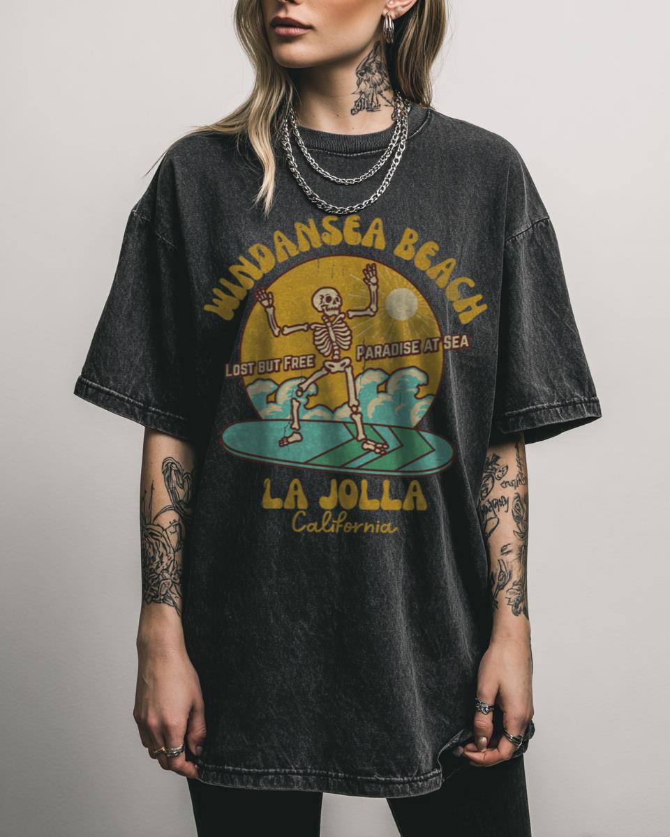 Longing for the iconic surf spots and vintage charm of 1960s California? Ride the wave of nostalgia with this ‘Retro Sixties Windansea Beach, La Jolla, California’ graphic tee. Featuring a vintage-inspired design with a hint of skeleton surf art and gold text, this shirt captures the legendary surf culture of Southern California. It’s perfect for…
