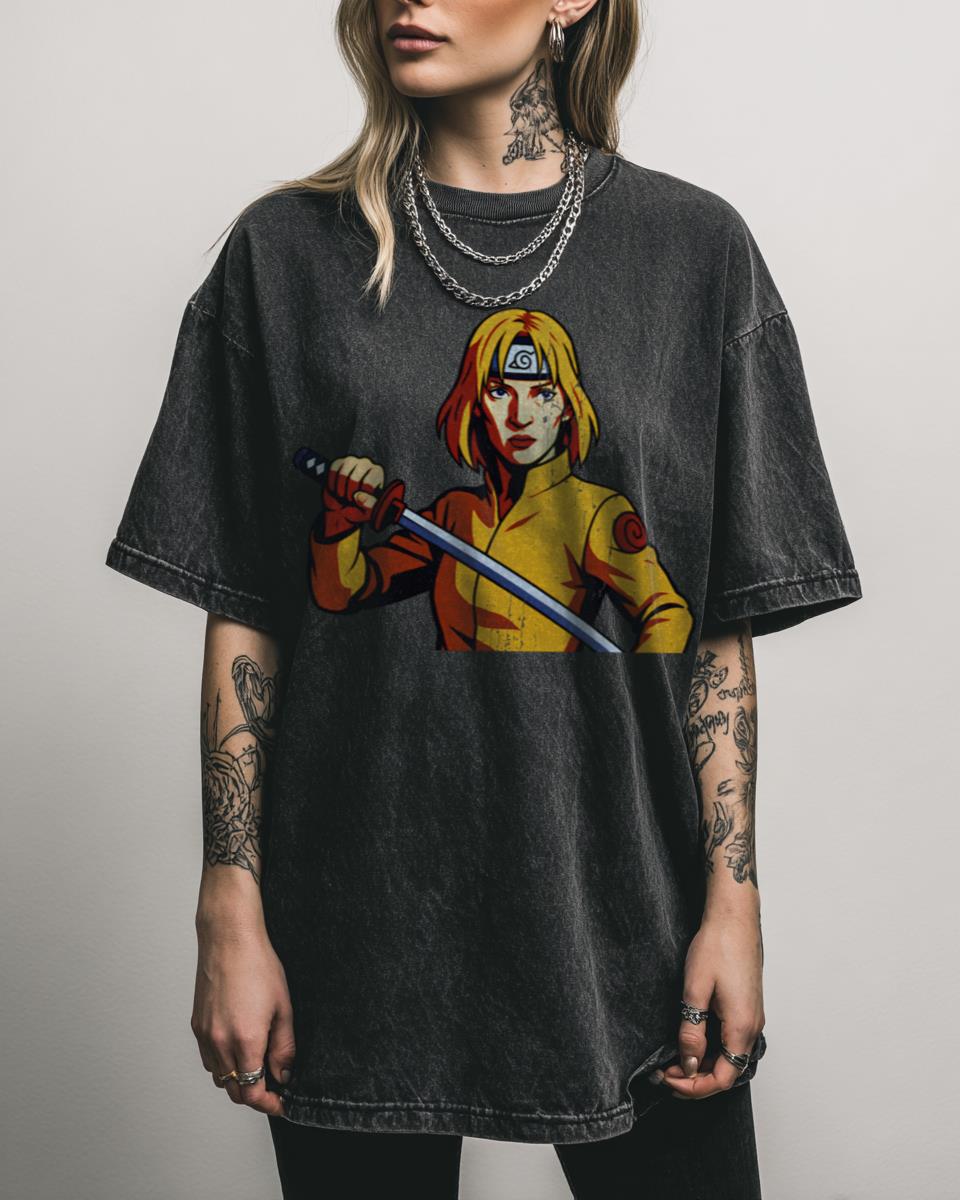 Ever imagined a legendary crossover between two iconic worlds? Experience the ultimate fanart fusion with this Kill Bill x Naruto Crossover T-Shirt! Featuring Beatrix Kiddo reimagined as a fierce Konoha Jōnin, this unique design blends the retro coolness of Kill Bill with the beloved ninja aesthetic of Naruto. A must-have for fans of both cult…
