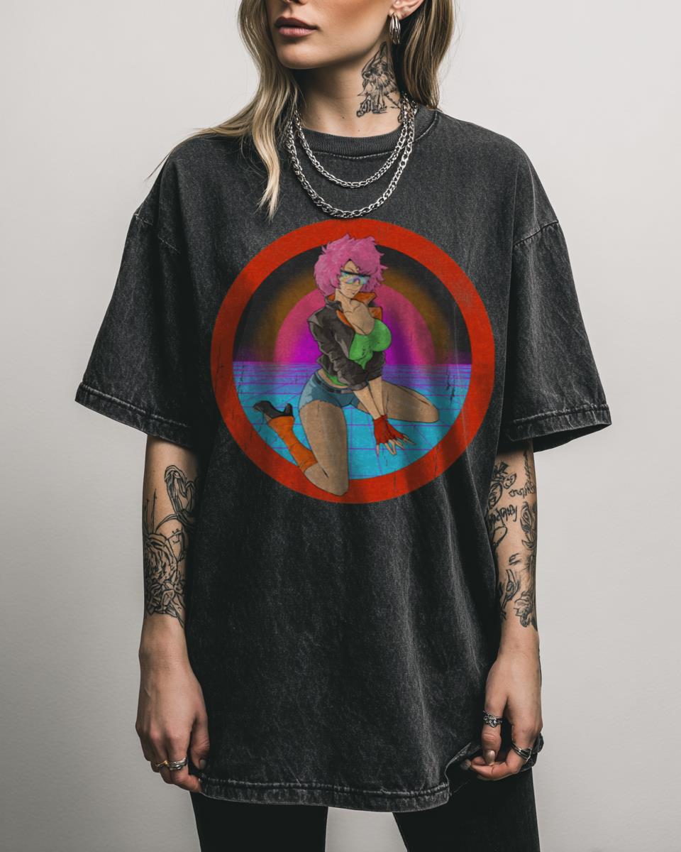 Looking for a statement piece that screams retro cool? Step back in time with our ‘Nostalgia Girl’ T-shirt, a vibrant tribute to the 80s and early 90s anime aesthetic. This unique design features an enigmatic anime girl with fishnet details, enveloped in a dreamy vaporwave and techno-inspired landscape. It’s a perfect blend of old-school charm…
