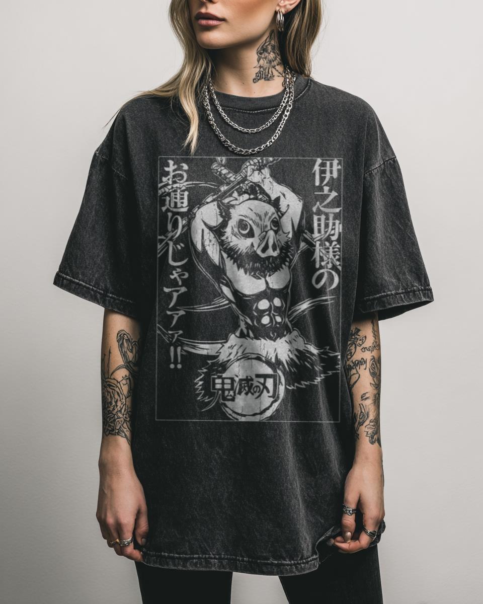 Are you ready to unleash your inner Beast Breathing demon slayer? Channel the wild spirit of Inosuke Hashibira with this dynamic Demon Slayer T-shirt. Featuring the iconic boar-headed warrior from Kimetsu no Yaiba, this design is a must-have for fans of the manga and anime, celebrating Inosuke alongside Tanjiro, Nezuko, and the fight against demons…