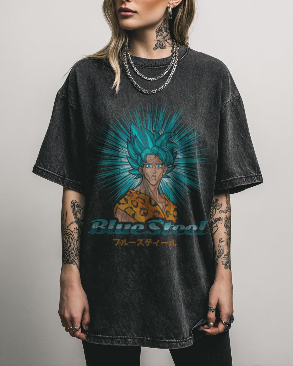 What Happens When Goku Masters the Blue Steel Pose? Witness the ultimate fusion of pop culture with our Blue Steel Super T-Shirt, a fan-created design that hilariously mashes up Dragon Ball Z’s Goku in his Super Saiyan God Super Saiyan form with Zoolander’s iconic “Blue Steel” pose. This black acidwash graphic tee, made from 100%…