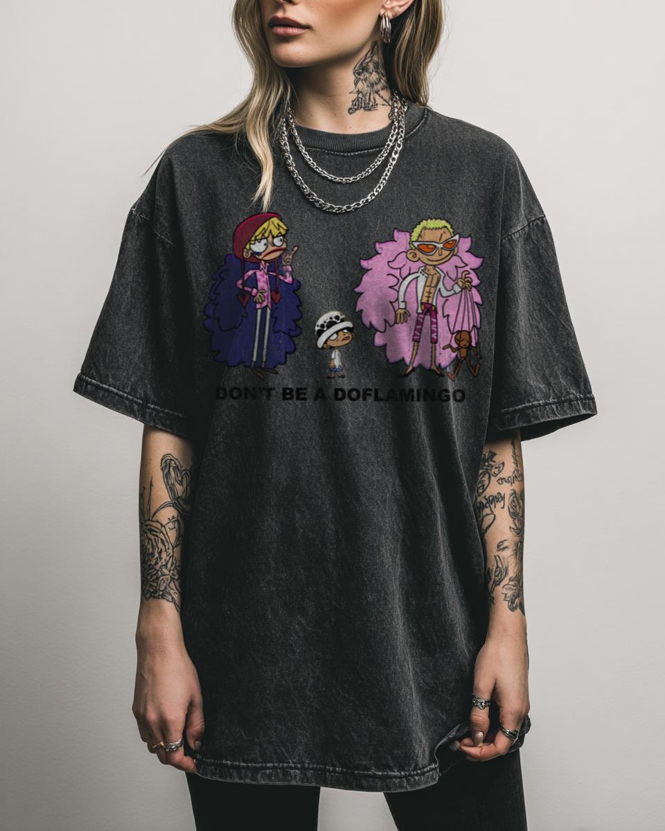 Are you a true pirate at heart, sailing the Grand Line with Luffy? Show your love for the epic world of One Piece with this unique T-shirt, featuring the playful warning “Don’t be a Doflamingo!” This design pays homage to the iconic anime, incorporating elements like Corazon, Law, and Luffy in a cool doodle style….