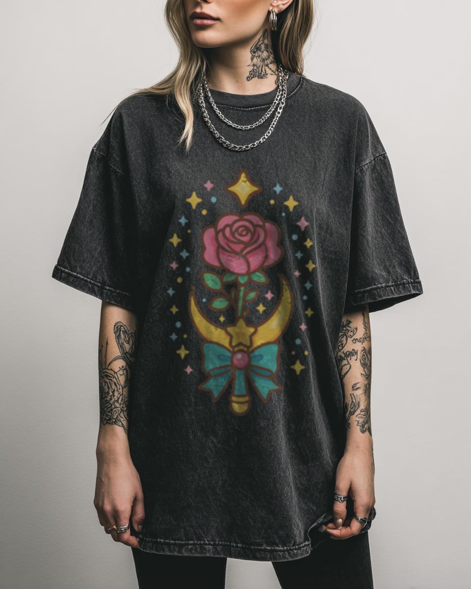 Why This Magical Rose Wand T-Shirt is a Sailor Moon Fan’s Dream? Channel your inner magical girl with this enchanting Magical Rose Wand T-Shirt, a fan-inspired design with a Kawaii Moon Scepter aesthetic reminiscent of Sailor Moon. This black acidwash graphic tee features a delightful enchanted rose and sparkles, perfect for fans of cute anime…