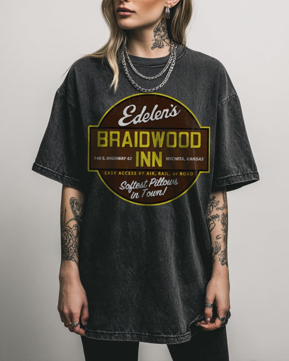 Relive the hilarious misadventures of a classic 80s road trip! Step into the world of ‘Planes, Trains & Automobiles’ with this ‘Braidwood Inn – Wichita KS’ graphic tee. This design pays homage to the fictional motel from the iconic John Hughes movie, a perfect tribute for fans of Steve Martin, John Candy, and their unforgettable…