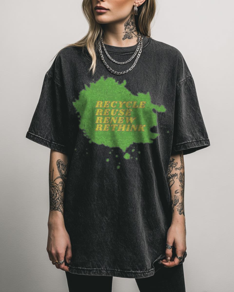 Are you championing a greener future and sustainable practices? Join the movement with this ‘RECYCLE REUSE RENEW RETHING’ Black Acidwash T-shirt! This design promotes essential environmental principles, encouraging thoughtful consumption and care for our planet. It’s a timely and trendy piece for eco-conscious individuals and anyone committed to making a positive impact on the environment….