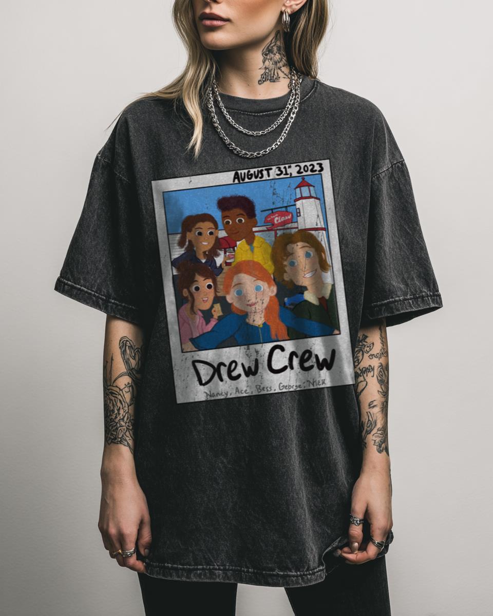 Are you a fan of the iconic Nancy Drew mysteries and the beloved Drew Crew? Join Nancy, Ace, Bess, Nick, and George with this exclusive “Drew Crew” T-shirt, celebrating the thrilling adventures in Horseshoe Bay. Perfect for fans of the mystery series, this design brings together your favorite characters and the iconic “The Claw” diner….