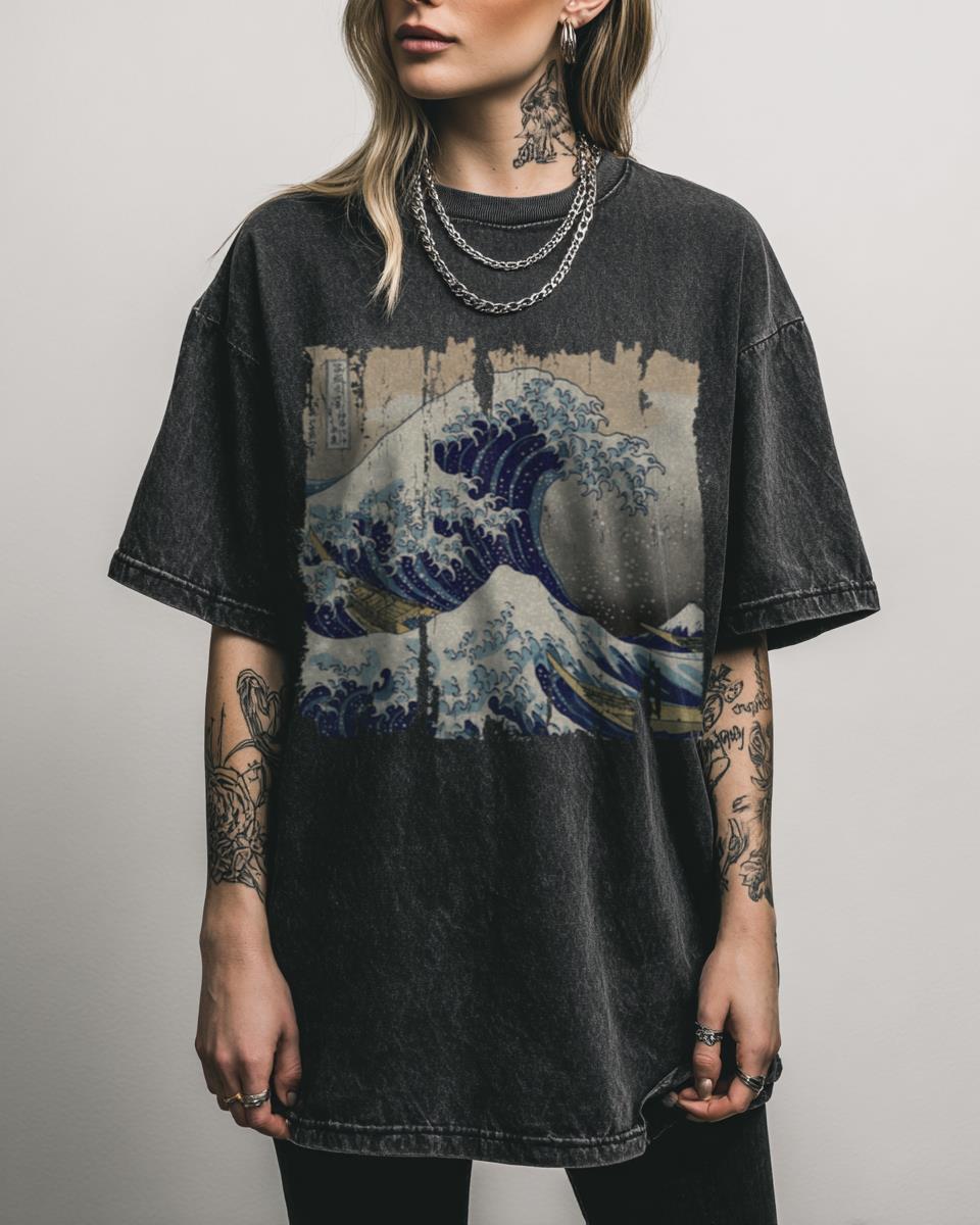 What Makes This Great Wave off Kanagawa T-Shirt a Classic? Adorn yourself with a masterpiece with this **Great Wave off Kanagawa T-shirt**, a fan-created design inspired by the iconic Japanese ukiyo-e print. Featuring a stunning printed graphic on a **black acidwash 100% cotton tee**, it’s perfect for fans of Japanese art, aesthetics, and vintage style….