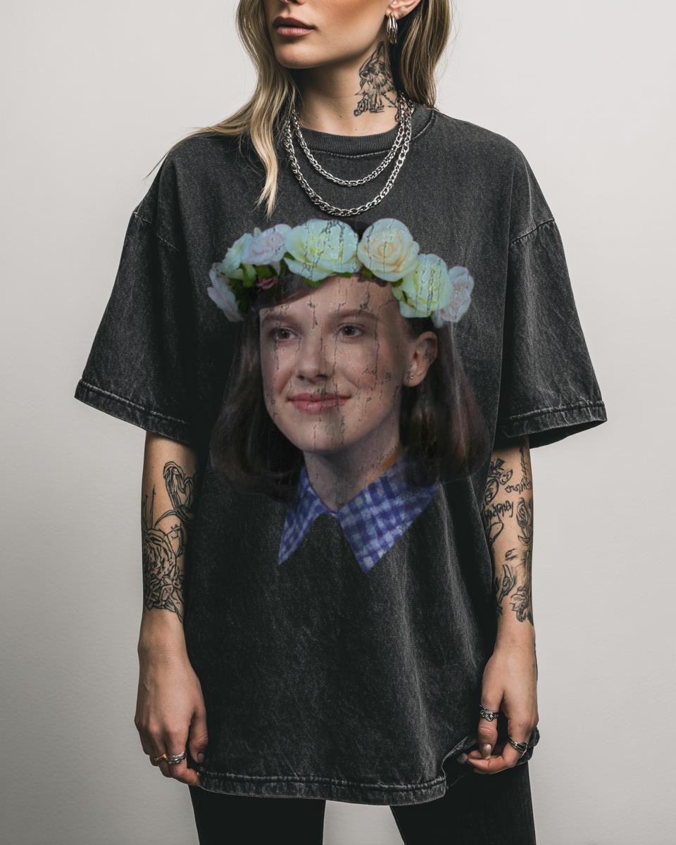 Are you a fan of the powerful and iconic Eleven from Stranger Things? Celebrate the incredible Millie Bobby Brown as Eleven from Stranger Things with this charming ‘Flower Crown’ design. This fan art captures a softer, yet still powerful, side of the beloved character Jane Hopper, adorned with a beautiful floral crown, blending her strength…
