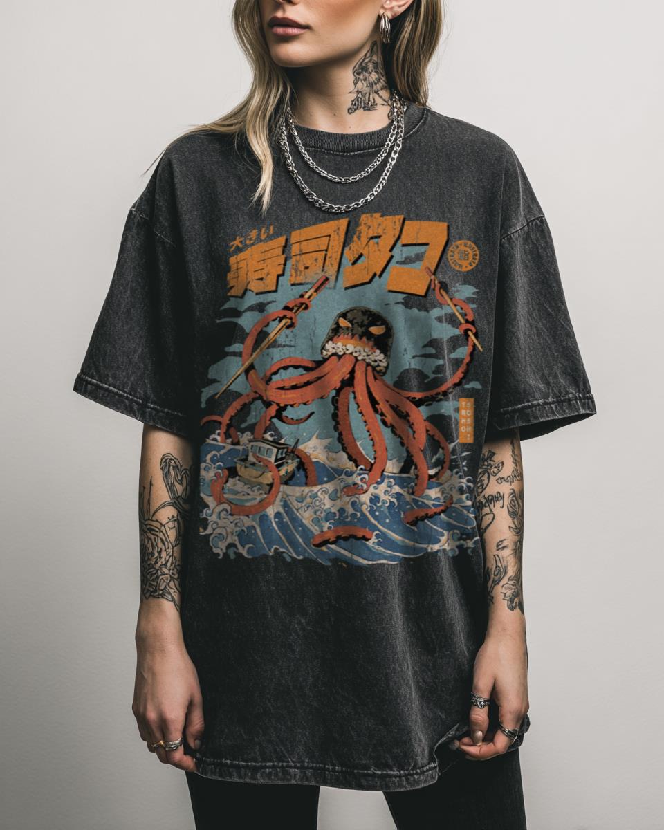 Craving a Taste of Edgy Japanese Art? Unleash the kraken with this ‘Black The Tako Sushi’ T-shirt, a dynamic design by Ilustrata! This retro Japanese graphic features an angry octopus (tako) as a kaiju monster, intertwined with sushi elements and powerful waves, reminiscent of classic anime and manga art. It’s perfect for fans of Japanese…