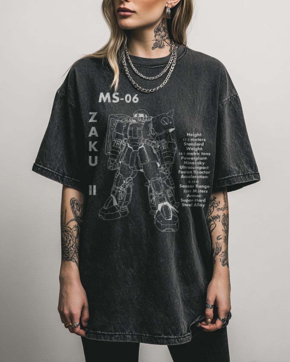 Are you a devoted fan of classic Gundam lore and iconic mobile suits? Dive into the engineering marvel of the Principality of Zeon with this ‘Zaku II Tech Specs’ T-Shirt! Featuring a detailed blueprint-style graphic of the legendary Zaku II mobile suit, this design is perfect for Gundam enthusiasts, mecha lovers, and anime fans who…