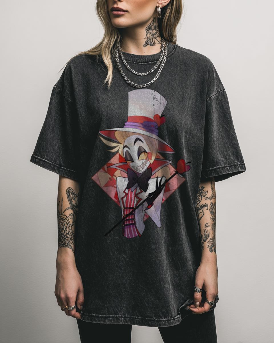 Ready to rule your wardrobe with the charming King of Hell himself? Command attention with this ‘Hazbin Hotel Lucifer’ design! This vibrant graphic features the charismatic Lucifer Morningstar in his signature style, capturing his regal yet whimsical personality from the popular animated series. Perfect for fans of Hazbin Hotel and Helluva Boss who appreciate its…