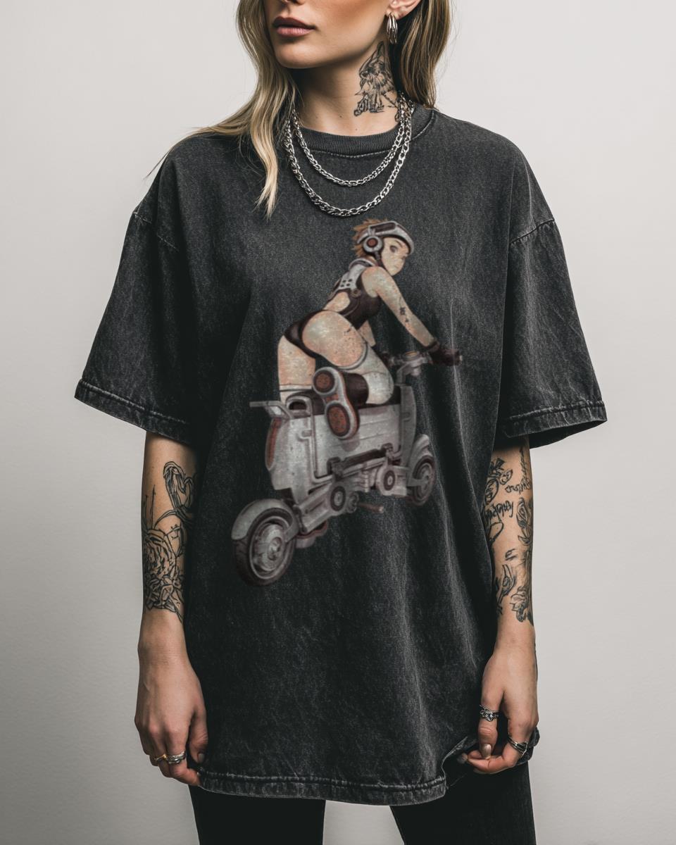 Ready to cruise into the future with a stylish nod to the past? This sleek ‘Ride’ graphic tee features a minimalist, retrofuturistic design of a scooter, blending 80s and 90s aesthetics with anime and Art Deco influences. It’s a stylish and unique piece that evokes a sense of freedom and a cool, nostalgic vision of…