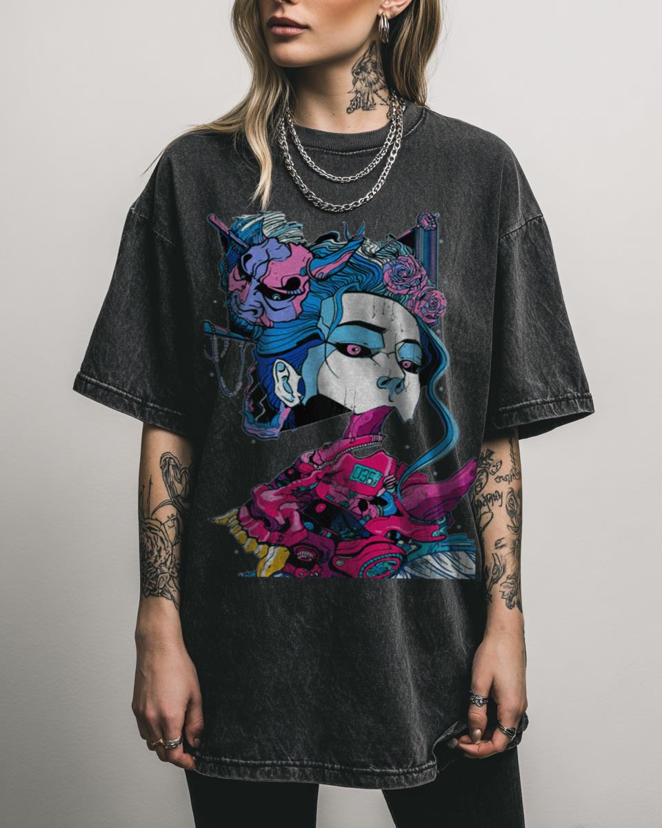 Merge ancient traditions with a futuristic vision in this stunning design! Unleash your inner warrior with this captivating ‘Cyberpunk Samurai Demon Mask’ design, featuring a Japanese girl in a classic sci-fi aesthetic. This striking graphic blends traditional samurai elements with a dystopian cyberpunk future, creating a powerful and unique statement piece for fans of manga,…