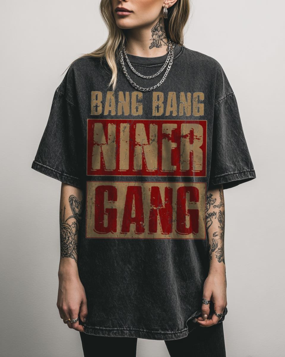 Are you ready to represent the faithful and shout ‘Bang Bang Niner Gang’? Show your unwavering support for the San Francisco 49ers with this ‘Bang Bang Niner Gang’ football design. Perfect for fans of legendary players like Joe Montana, Jerry Rice, and modern stars like Deebo Samuel and Nick Bosa. This cool graphic tee is…