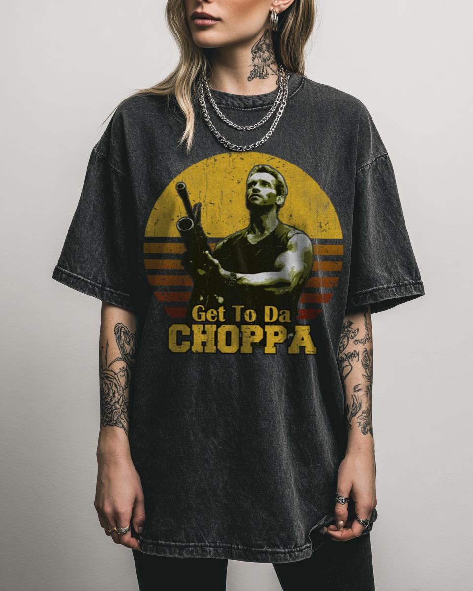 Ready to relive a classic 80s action movie moment? Channel your inner Arnold Schwarzenegger with this iconic ‘Get To Da Choppa’ Predator movie design! This retro graphic pays homage to one of the most quotable lines from the legendary 80s film, Predator. Perfect for film buffs, action movie lovers, and fans of Arnie and classic…