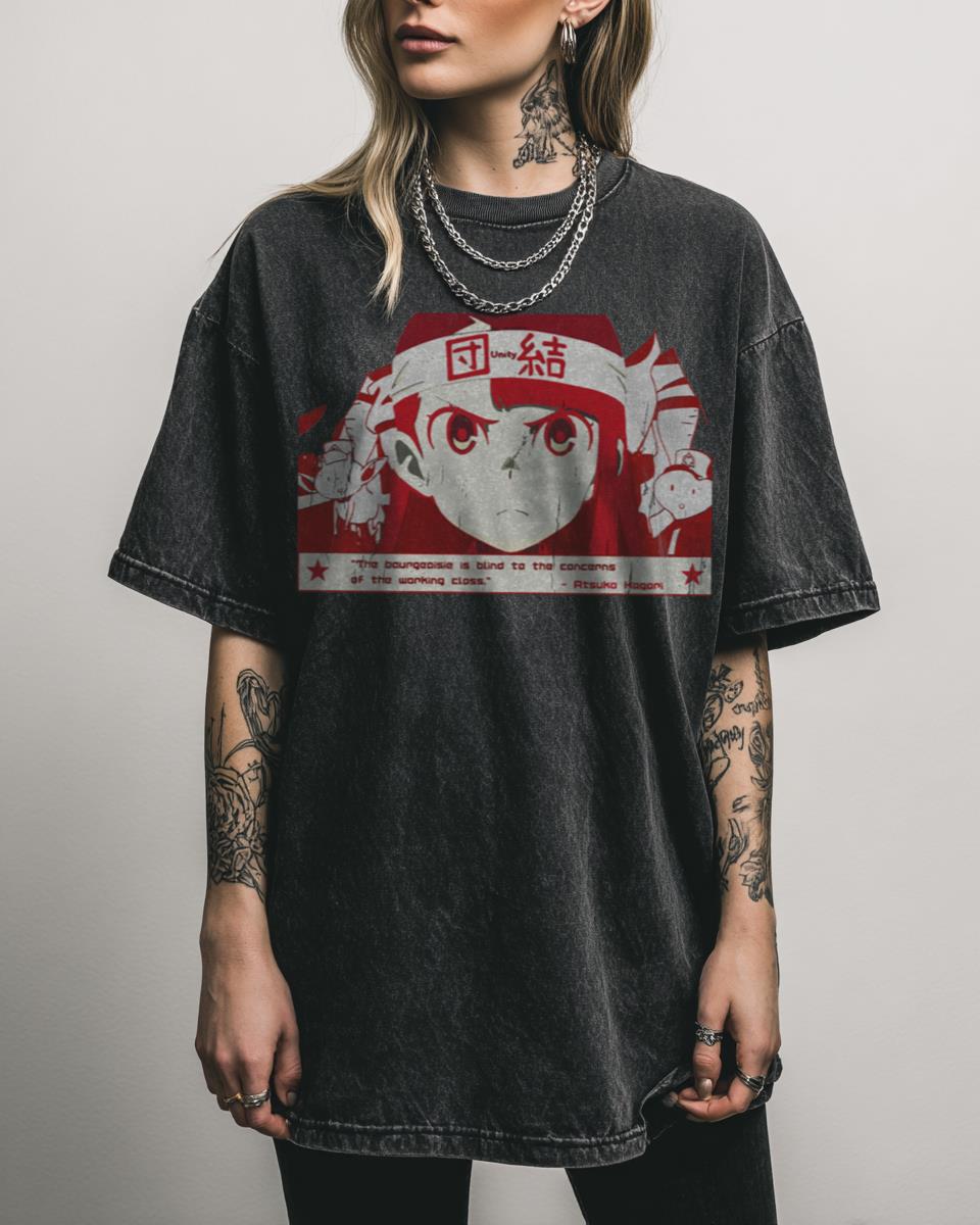 Ready to revolutionize your wardrobe with a touch of kawaii rebellion? Dive into the world of subversive cuteness with this eye-catching graphic tee. The design features a charming anime witch, reminiscent of Atsuko Kagari from Little Witch Academia, adorned with playful communist symbolism. It’s a perfect blend of Japanese kawaii aesthetics and revolutionary spirit, sure…