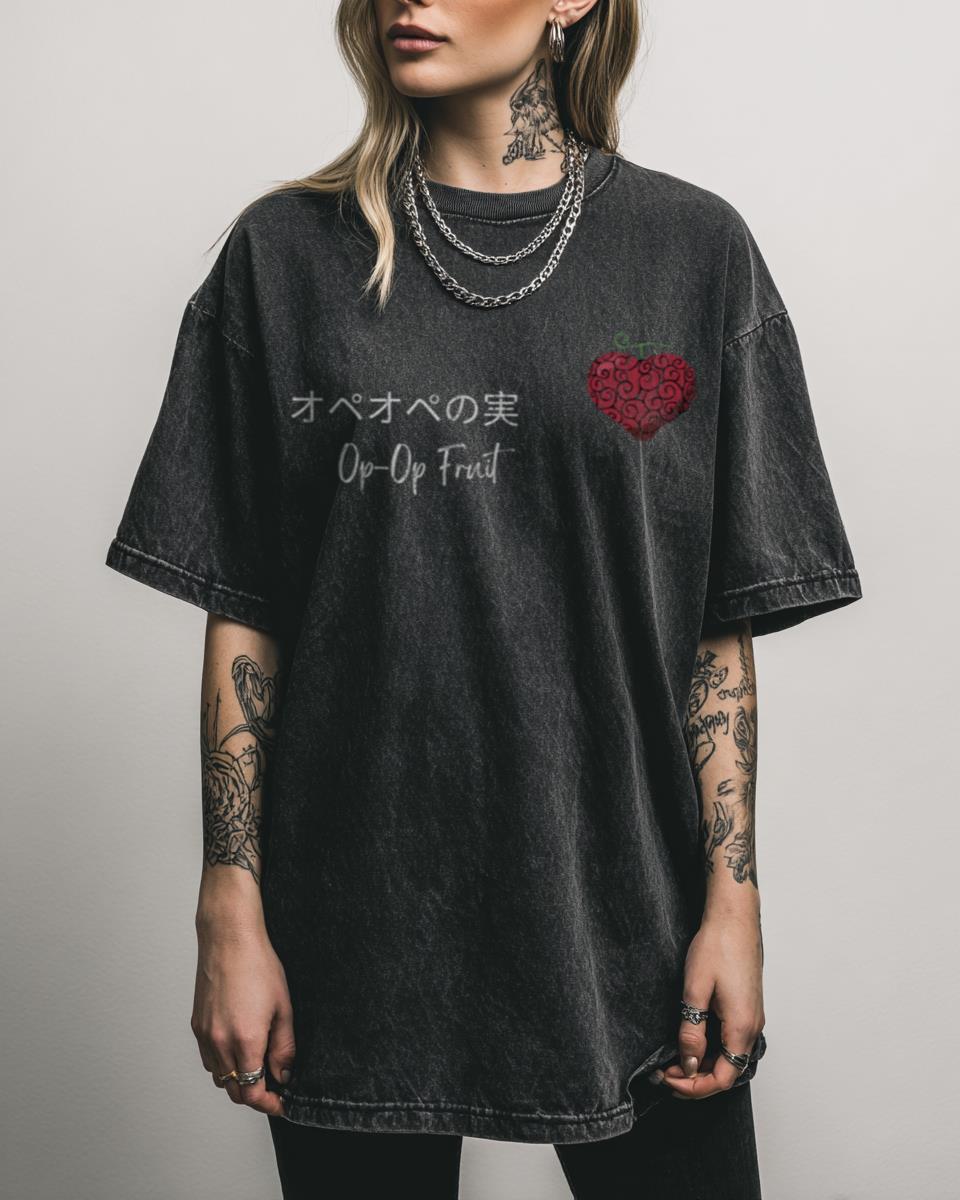 What Makes the One Piece Op Op Fruit T-Shirt Special? Unleash the power of the Surgeon of Death with this striking One Piece Op Op Fruit T-Shirt. Featuring the iconic Devil Fruit associated with Trafalgar Law, this black acidwash tee is a must-have for any fan of the Grand Line’s most strategic pirate. It’s a…