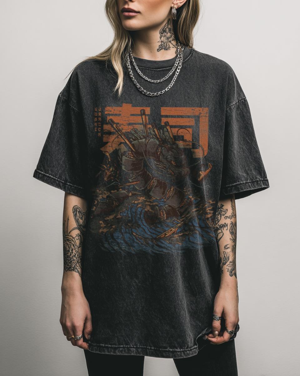 What Makes This Great Sushi Dragon T-Shirt So Unique? Unleash a monstrous appetite with this **Great Sushi Dragon T-shirt**, a fan-created design by ilustrata. Featuring an angry, orange, anime-style dragon emerging from a sushi wave on a **black acidwash 100% cotton tee**, it’s perfect for fans of kaiju, funny food art, and Japanese aesthetics. Why…