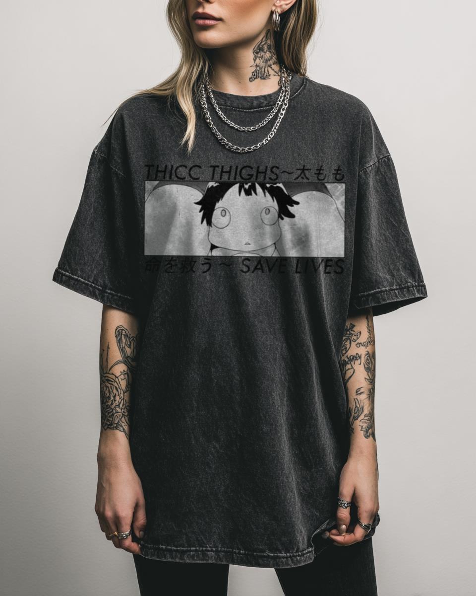 Why is This ‘Thicc Thighs Save Lives’ T-Shirt a Bold Statement? Make a confident and humorous statement with this ‘Thicc Thighs Save Lives’ T-shirt. This edgy graphic tee, popular in anime and weeb culture, is printed on a unique black acidwash fabric, perfect for those who appreciate bold, fun, and body-positive apparel. Key Features of…