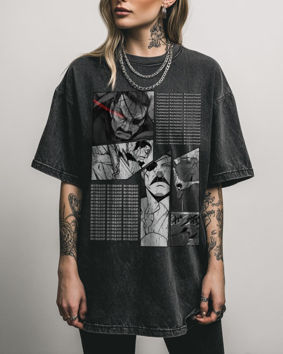 Are you a dedicated fan of Fullmetal Alchemist and its formidable characters? Embrace the power of the Führer with this striking ‘King Bradley Manga Stripe Design’ tee! This graphic features the iconic character from the beloved anime and manga series, rendered in a dynamic vintage stripe style. Perfect for fans who appreciate complex villains and…