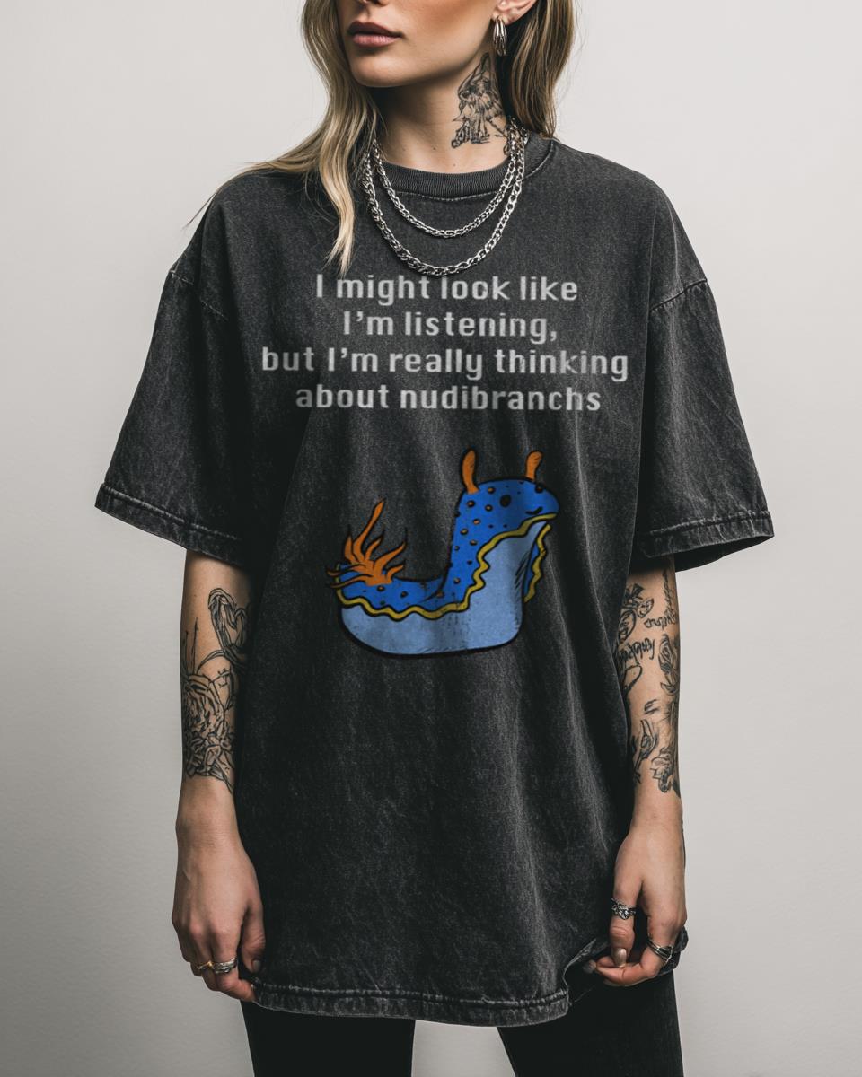 Do you ever find yourself pondering the fascinating world of nudibranchs? Express your quirky love for marine life with ‘Thinking About Nudibranchs (white text)’ T-shirt! This funny and cute design features a cartoon nudibranch, making it perfect for ocean lovers, marine biologists, or anyone who enjoys a unique nature joke and the wonders of sea…