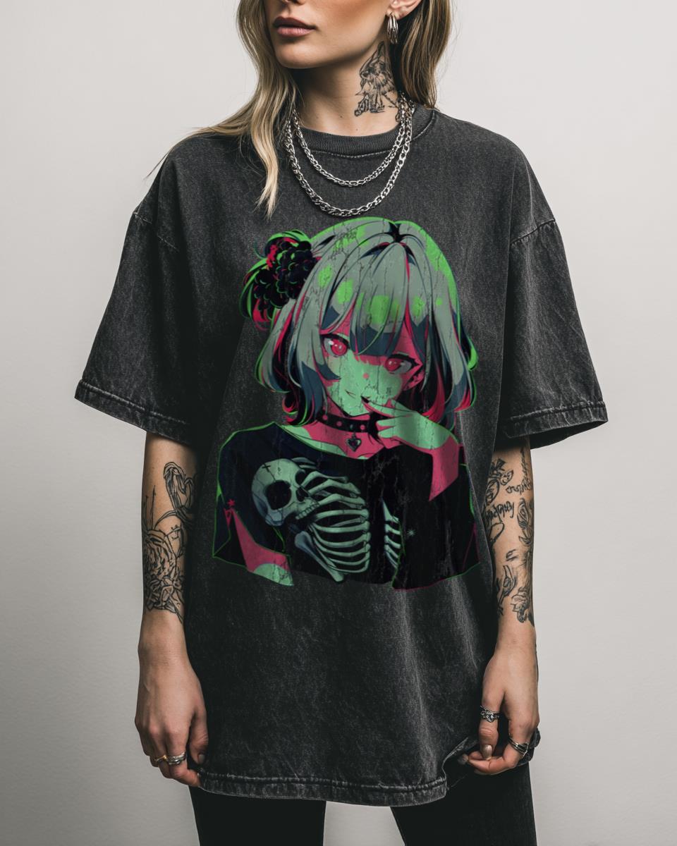 Looking for a unique blend of cute, creepy, and kawaii for your wardrobe? Embrace the unexpected with this “Anime Bones – Cute Kawaii Anime Zombie Girl” T-shirt! This design perfectly combines adorable anime aesthetics with a touch of spooky zombie charm, creating a truly unique waifu character. It’s a must-have for fans of kawaii horror…