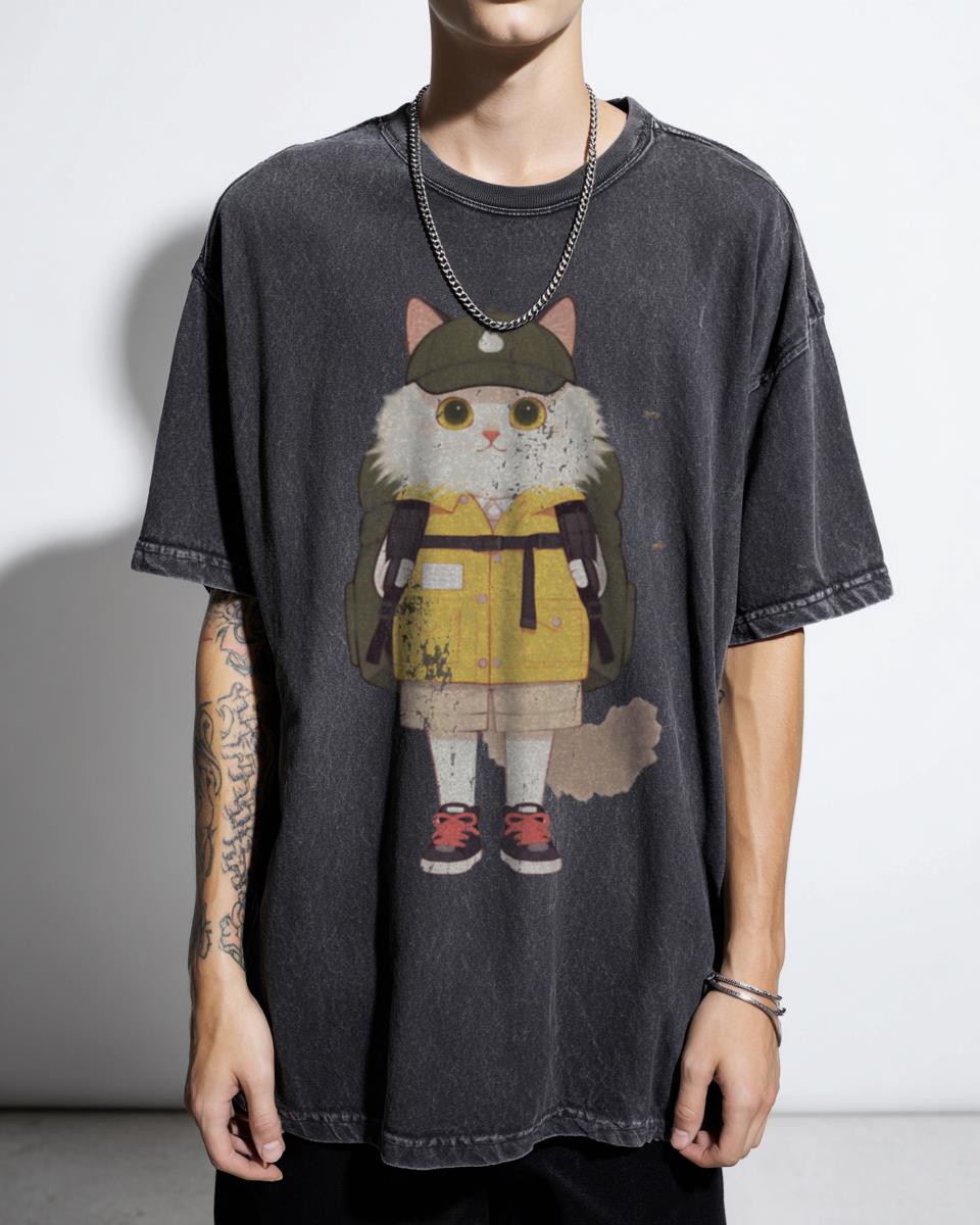 Embrace your love for adventure and felines with this charming hiking cat t-shirt. Featuring a cute cartoon explorer cat geared up with a backpack on a stylish black acidwash canvas, this tee is perfect for anyone who loves camping, hiking, and the great outdoors.