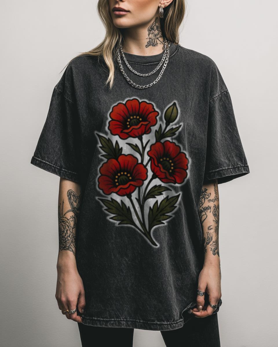 This t-shirt comes in a unisex regular fit. Please refer to the size chart for specific measurements. To keep the poppies bright, machine wash cold and tumble dry low.