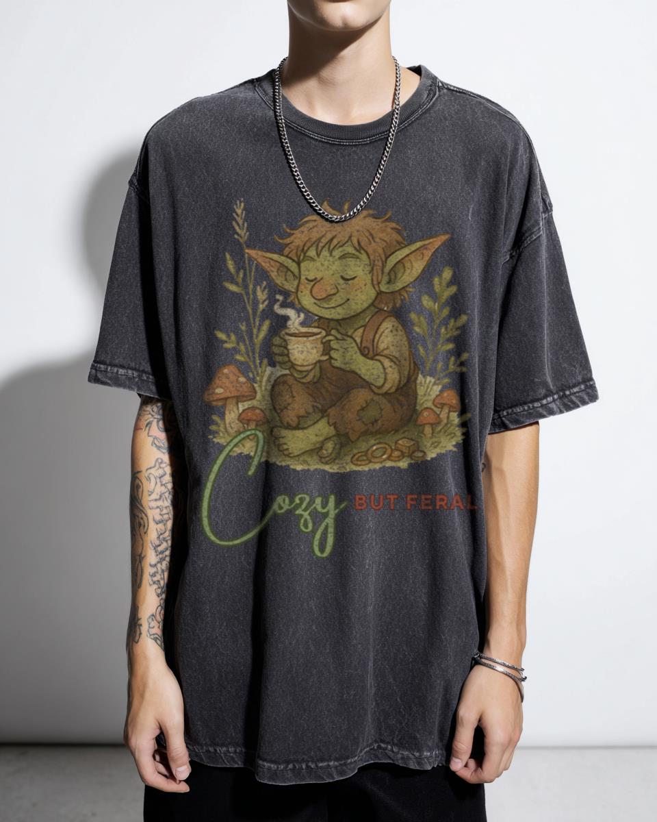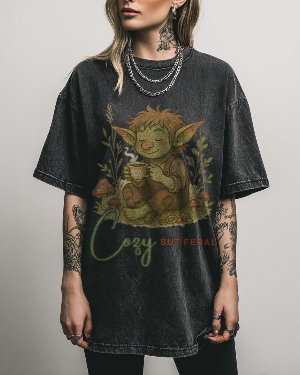 Embrace your inner whimsical creature with this ‘Cozy, but Feral’ Cottagecore Goblin t-shirt. Perfect for fans of the goblincore aesthetic, this design captures the charming chaos of hoarding trinkets and loving nature. It’s a celebration of mossy vibes, mushroom forests, and the rustic magic of the woods.