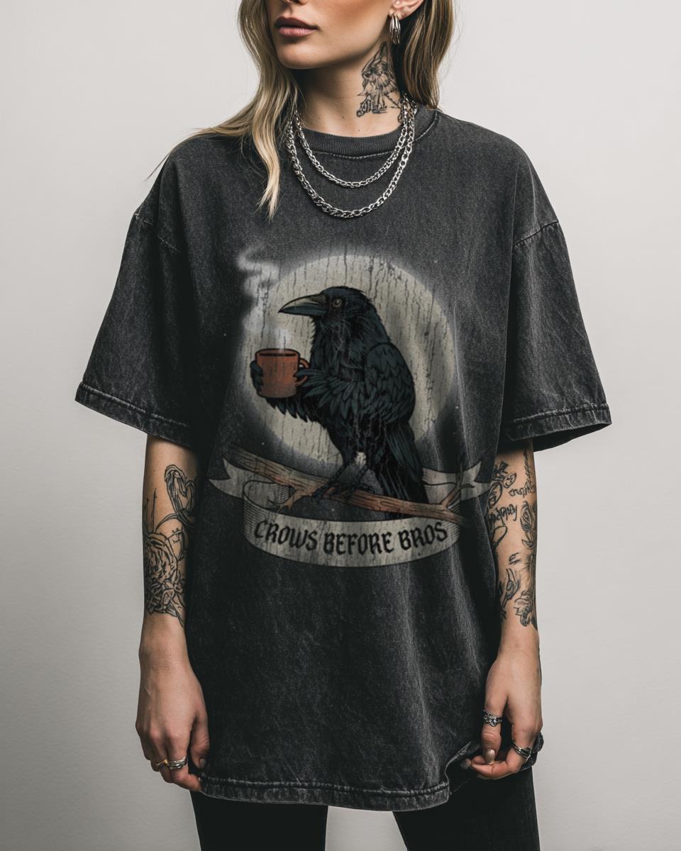 Show off your priorities with a touch of humor with this ‘Crows Before Bros’ t-shirt. Featuring a cool, vintage-style graphic of crows under a moonlit sky, this tee is perfect for bird lovers, coffee drinkers, and anyone with a witty sense of humor. It’s a fun play on words that’s sure to get a smile.