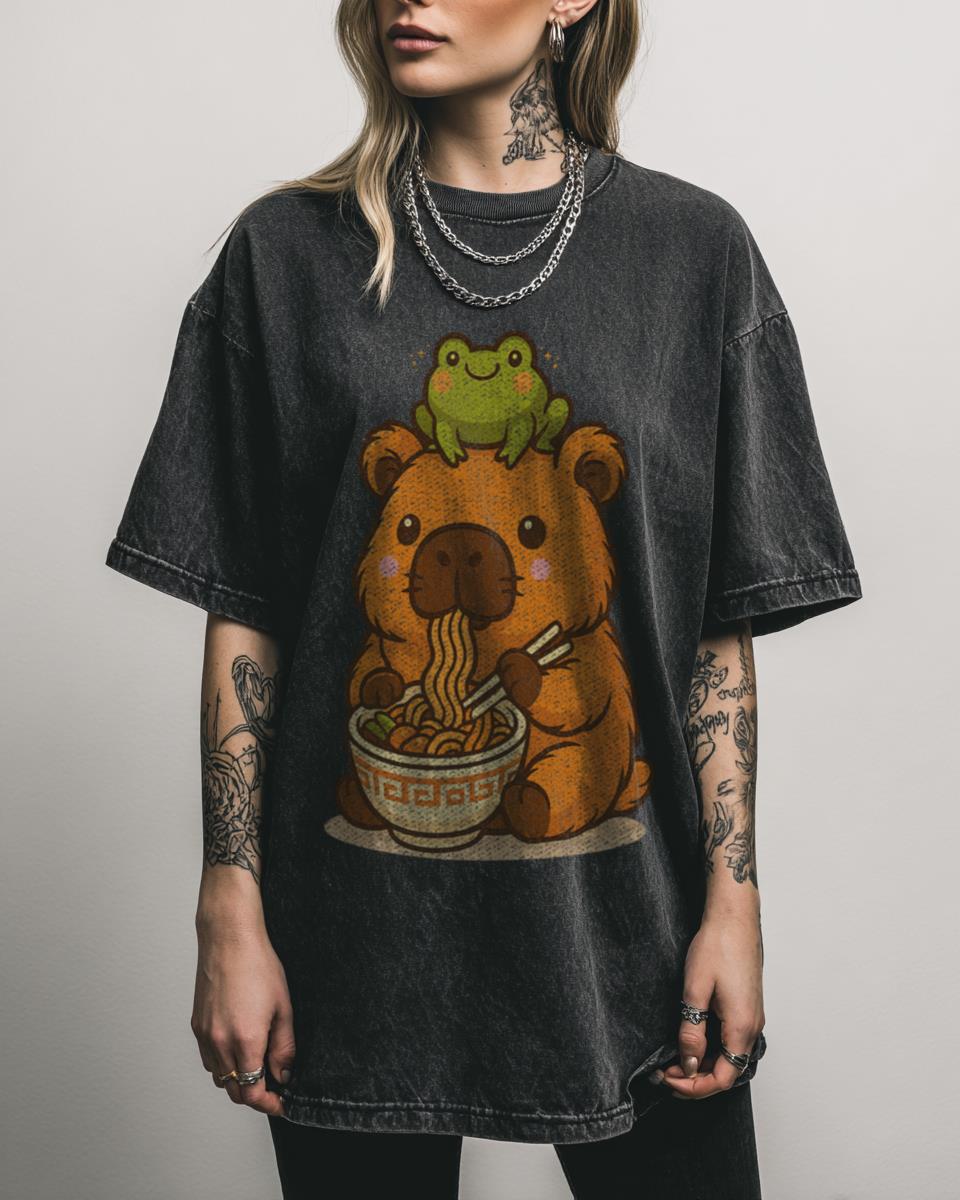Kawaii Capybara & Frog T-Shirt | Cute Ramen Lover Tee